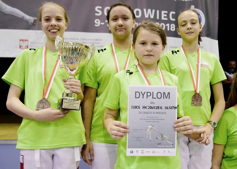 Drużyna I UKS Hajduczek Olsztyn (Aniela Kozłowska, Nina Kondrusik, Alicja Woźniak, Antonina Dobies) w pierwszym meczu pewnie pokonała AZS AWF Warszawa 36:26, w kolejnym II TMS Sosnowiec 36:29 awansując do półfinału, gdzie spotkały się z faworytkami I TMS Sosnowiec. W walce o finał przegrały 20:36. W meczu o 3. miejsce spotkały się z silną drużyną KKSZ Konin. – Przed dwoma kończącymi mecz walkami nasze szablistki przegrywały 28:24. Nina zmniejszyła różnicę z czterech do jednego punktu, kończąc swoją świetną walkę stanem 31:32 dla Konina. Na planszę wyszła Aniela. Po kilkunastu akcjach był już stan 35:34 dla przeciwniczek. Tu Aniela zachowała do końca zimną krew, nie ulegając emocjom. Pewnie wykonała akcję na wyrównanie 35:35, by w kolejnej zrobić akcję na jedną lampę, tak żeby nie było wątpliwości, kto zdobywa brązowy medal – komentuje Adam Sobczyk.